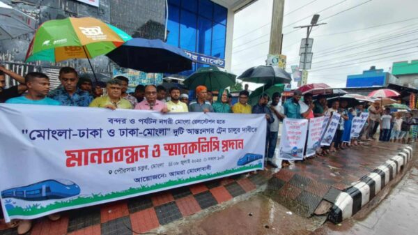 মোঃ নূর আলম বাচ্চু,মোংলা (বাগেরহাট): বন্দর ও পর্যটন নগরী মোংলার রেল স্টেশন হতে “মোংলা-ঢাকা ও ঢাকা-মোংলা” দুটি আন্ত:নগর ট্রেন চালুর দাবিতে মোংলায় মানববন্ধন ও রেলপথ মন্ত্রণালয়ের উপদেষ্টা বরাবর স্মারকলিপি প্রদান